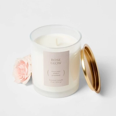 Illuminate your space with the 1-Wick 11oz Glass Jar Candle Rose Glow from Threshold™. The captivating blend of Rose, Geranium, and Amber fills the air, creating a warm ambiance. Housed in an elegant glass container, this candle stands at 3.94 inches, radiating a soft glow for approximately 35 hours. Crafted with a mix of Soy and Paraffin Wax, it’s a perfect addition for a cozy and fragrant atmosphere.