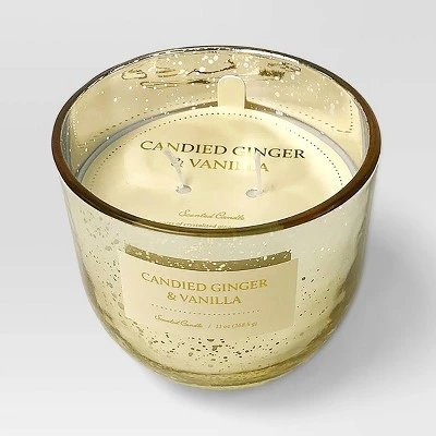 Immerse your surroundings in the inviting scent of the 2-Wick 13oz Mercury Glass Candle in Candied Ginger and Vanilla Tan from Threshold™. With an elegant glass container and two wicks, this candle offers approximately 45 hours of burn time. Crafted from palm and paraffin wax, it creates a warm and inviting atmosphere, making it a perfect addition to your home.