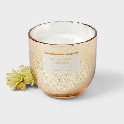 Immerse your space in the captivating allure of this 2-Wick 13oz Mercury Glass Candle Enchanting Tuberose Cream – Threshold™. Encased in a luxurious gold glass jar, this scented candle emanates a warm glow and a delightful blend of tuberose. Featuring 2 wicks, this Enchanting Tuberose candle offers 45 hours of enchanting burn time, creating a cozy ambience that transforms any moment.