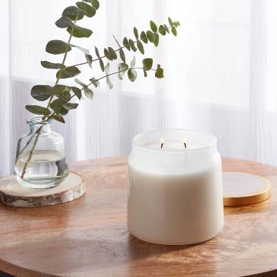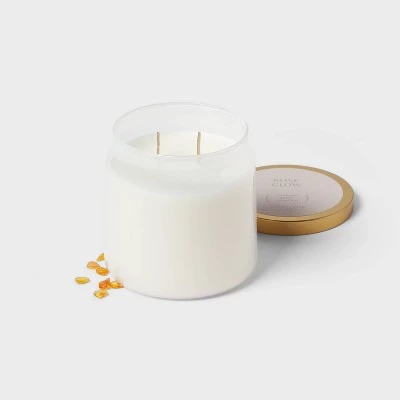 Illuminate your space with the 2-Wick 16oz Glass Jar Candle Rose Glow from Threshold™. This lidded candle features a dual-wick design, ensuring an even, warm ambiance. Housed in a 16oz glass jar, the captivating scent of Rose, Geranium, and Amber fills the air, creating a cozy atmosphere. With a burn time of approximately 60 hours, this soy and paraffin wax blend candle promises enduring charm.