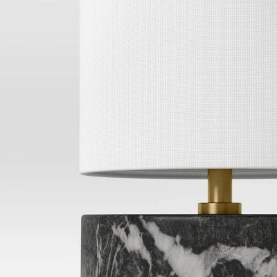 Illuminate any space in style with this Faux Marble Mini Table Lamp from Threshold™. This cylindrical mini table lamp features a black and white faux marble base that’s paired with a white linen drum shade for a modern look. The one-way light setting with a cord rocker switch allows for easy use. Place it on any side table next to your sofa, on the console table or on a nightstand in the bedroom for an inviting look.