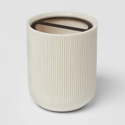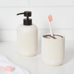 Add a chic touch of texture to your bathroom countertop with this Sand Modern Resin Toothbrush Holder from Threshold™. This resin soap pump makes a great addition to your bath accessories. It showcases a cream color with a ribbed finish to bring a touch of modern texture and style. The black divided section makes it great for holding your toothbrush, toothpaste or any other bathroom essential. You can pair with similar items from the same collection to complete your coordinated bathroom set.