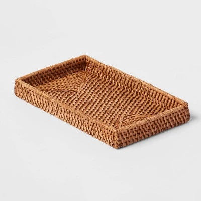 Keep your bathroom counter organized and tidy with this Rattan Tray from Threshold™. This decorative rattan tray brings storage and natural style to your bathroom. It showcases a light brown woven finish for textured appeal that blends with any bathroom decor, and the rectangular-shaped tray with raised sides helps keep small items and bottles contained. Complete the look with coordinating bath accessories, and simply spot clean for easy care.