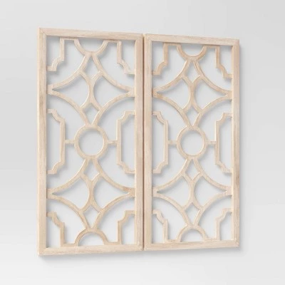 Give your space an elevated look when you add the Set of 2 Wood Lattice Wall Hangings from Threshold™ to your interior. These decorative lattices have an elegant look with their airy, carved detailing and light, natural hue. Display these wall lattices to give your room a more open feeling with a sophisticated touch. You can even customize them to suit your aesthetic by displaying small accents within the cutouts of the lattices for a bit more dimension. Threshold™: Looks like home, feels like you. Due to lighting and monitor differences, actual colors and finishes may vary slightly from what appears online.