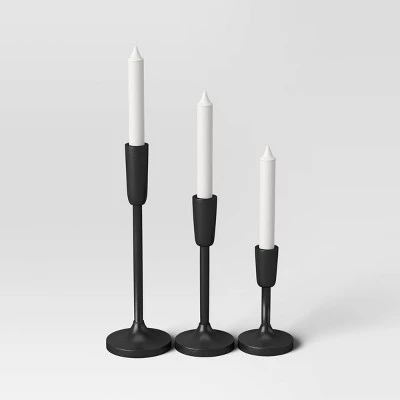 Add a warm glow to your interiors with this Set of 3 Aluminum Taper Candleholders from Threshold™. Made of black-finished metal, this set of candleholders includes three different-sized taper candleholders that can be displayed on the center table, mantle top or on any countertop to bring radiant style to your home. The trio of freestanding candleholders, each with a single holder at the top and a slender pole body with a rounded base, looks best when displayed together for a dramatic flicker effect.