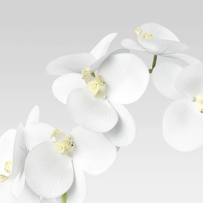 Bring year-round beauty and elegance to any space with this Small Potted Orchid from Threshold™. This artificial potted plant with white orchid flowers and lush green leaves adds a hint of breezy appeal to your home, and it comes potted inside a white ceramic container for easy display on any flat surface. The artificial construction requires no maintenance, and it looks pretty whether displayed solo or along with other plants. Simply place this faux potted plant on your desk, coffee table or a shelf to add airy vibes to your space.