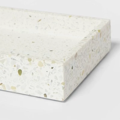 Keep small accessories or hair and skincare products neatly organized with this Terrazzo Bathroom Tray from Threshold™. This rectangular bathroom tray is made with terrazzo material that creates a unique appearance, with chips of green, blue, gray and light-blue poured together with a white material to create a sleek, modern look. The raised edges help keep your small items or bottles contained, while the smooth design is easy to clean to keep it looking fresh.
