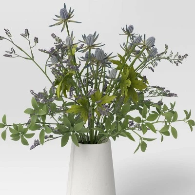 Add maintenance-free greenery to any space with this Thistle and Lavender Arrangement from Threshold™. This decorative arrangement showcases faux thistle and lavender flowers with green leaves on branches tightly grouped together and potted inside a ceramic container. Place it on your entryway console or dining table alone or with other real or faux plants for lovely display.